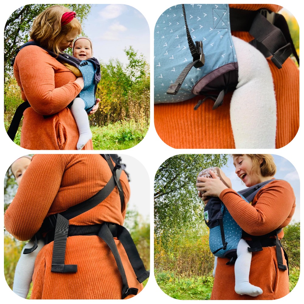 Litt om meg: Jeg er 158 høy og størrelse small. Jeg bærer en gutt på snart 15 måneder som har bikket 12 kg. Jeg bærer mest på rygg og har prøvd til sammen rundt 11 bæreseler. Jeg bærer også i sjal. Pappaen i hus er 183 og i øvre del av størrelsesskalaen på klær. Vi får derfor testet ytterpunktene av de selene vi prøver. Grunnen til at jeg tenker det er greit å ha litt informasjon om oss, er at en sele sitter ulikt på forskjellige type kropper. Det jeg synes er komfortabelt er ikke nødvendigvis det samme som deg. Derfor må min anmeldelse av denne selen sees i lys av hvem som bærer og alder på ungen som er prøvd oppi sela. Skulle gjerne testet med nyfødt også, det er nok en helt annen opplevelse.