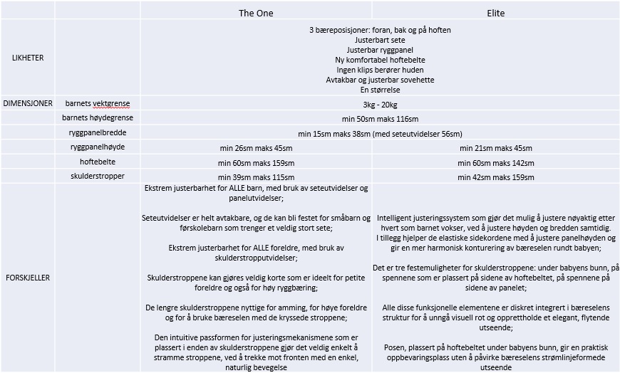 Savner de stroppene foran på skulderstroppene man kan dra ned på the one for amming i sele. De er veldig praktiske. Men stroppene er i alt mer behagelige på Elite da. Så er jo alltid litt give and take.